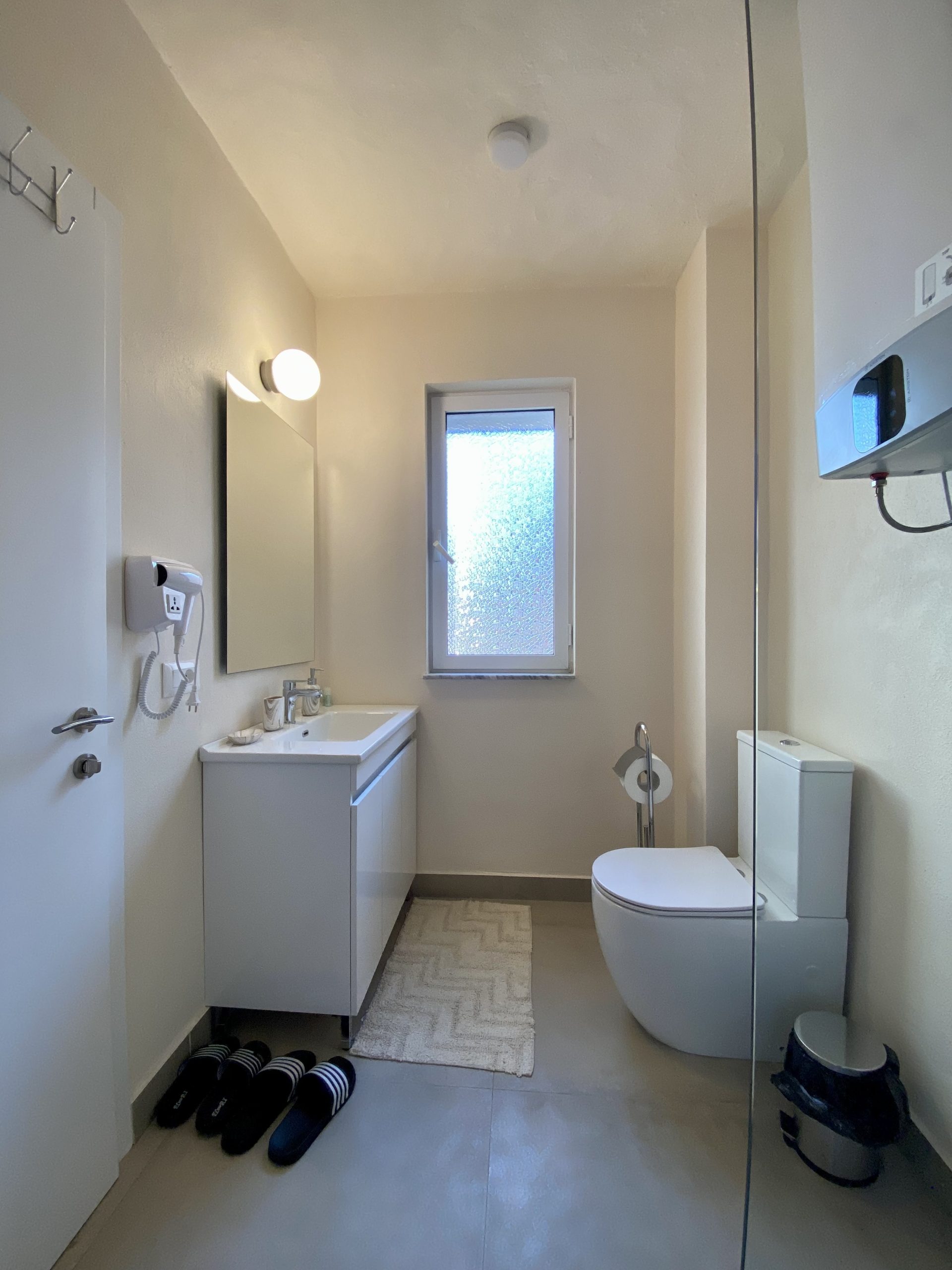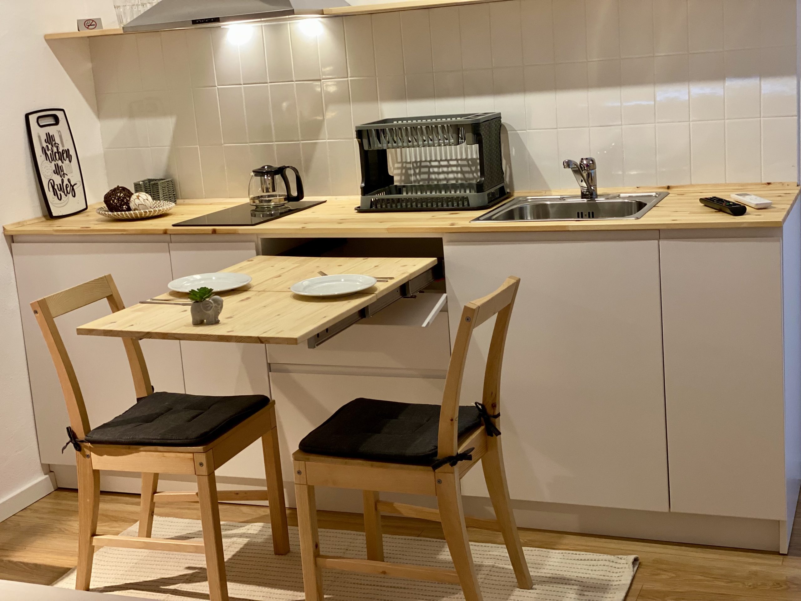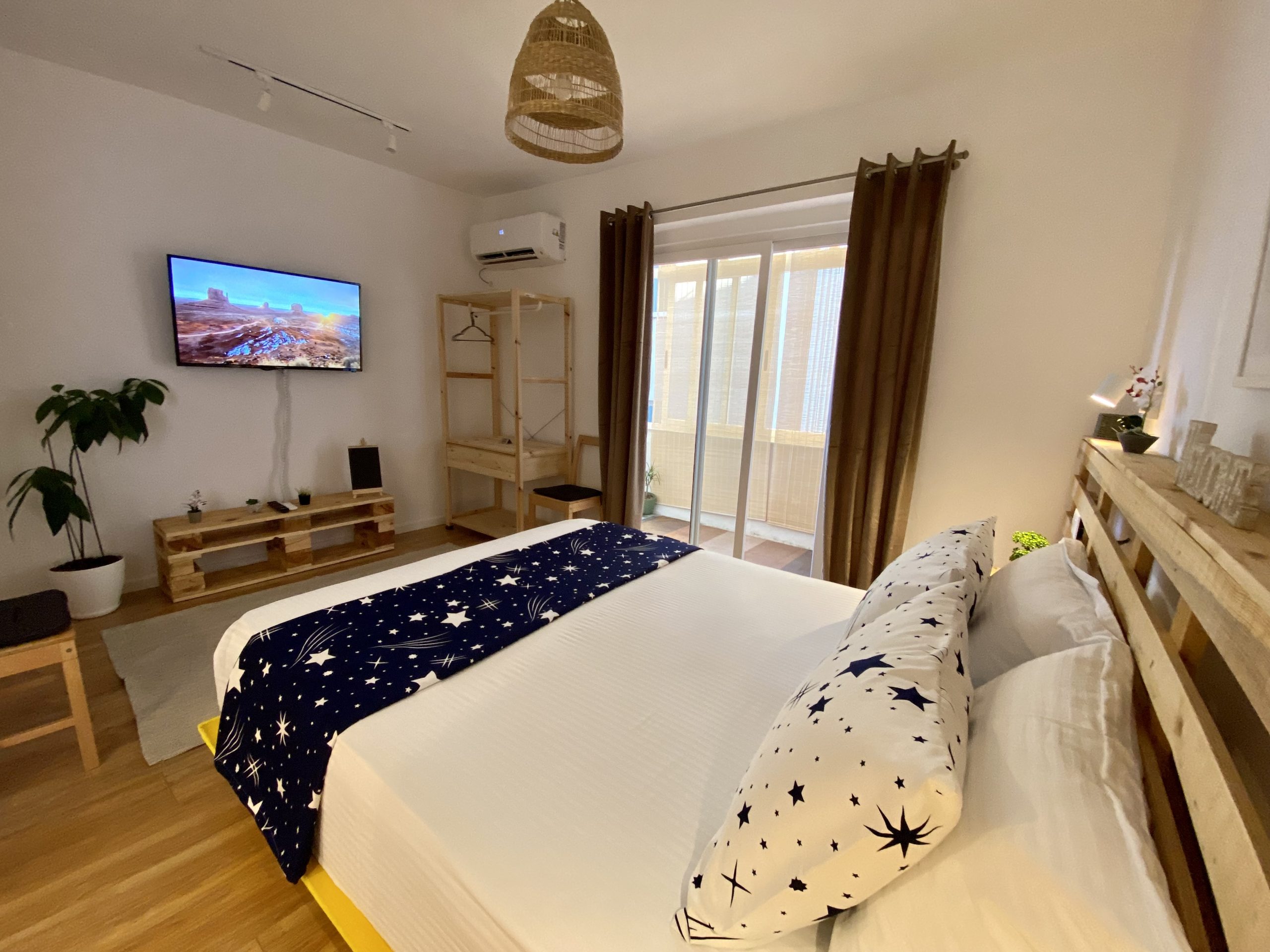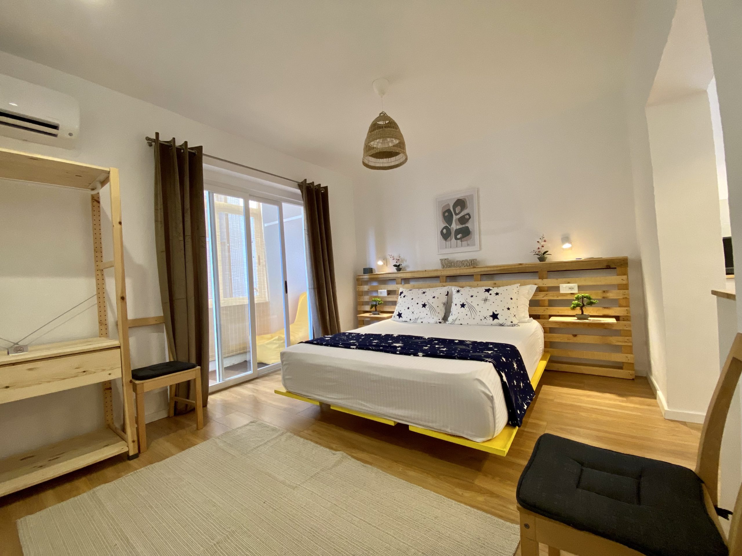 - Amenities: Air conditioning, Balcony, Bed linens, Bidet, Body soap, Cleaning Products, Clothing storage, Cooking Basics, Dining area, Dining table, Dishes and silverware, Drying rack for clothing, Essentials, Ethernet connection, Flat-screen TV, Free WiFi, Freezer, Hair dryer, Hangers, Hot water, Iron, Kitchenette, Long term stays allowed, Netflix, Paid parking off premises, Refrigerator, Room-darkening shades, Shampoo, Shower gel, Single level home, Stove, TV, Washer, Wine glasses
