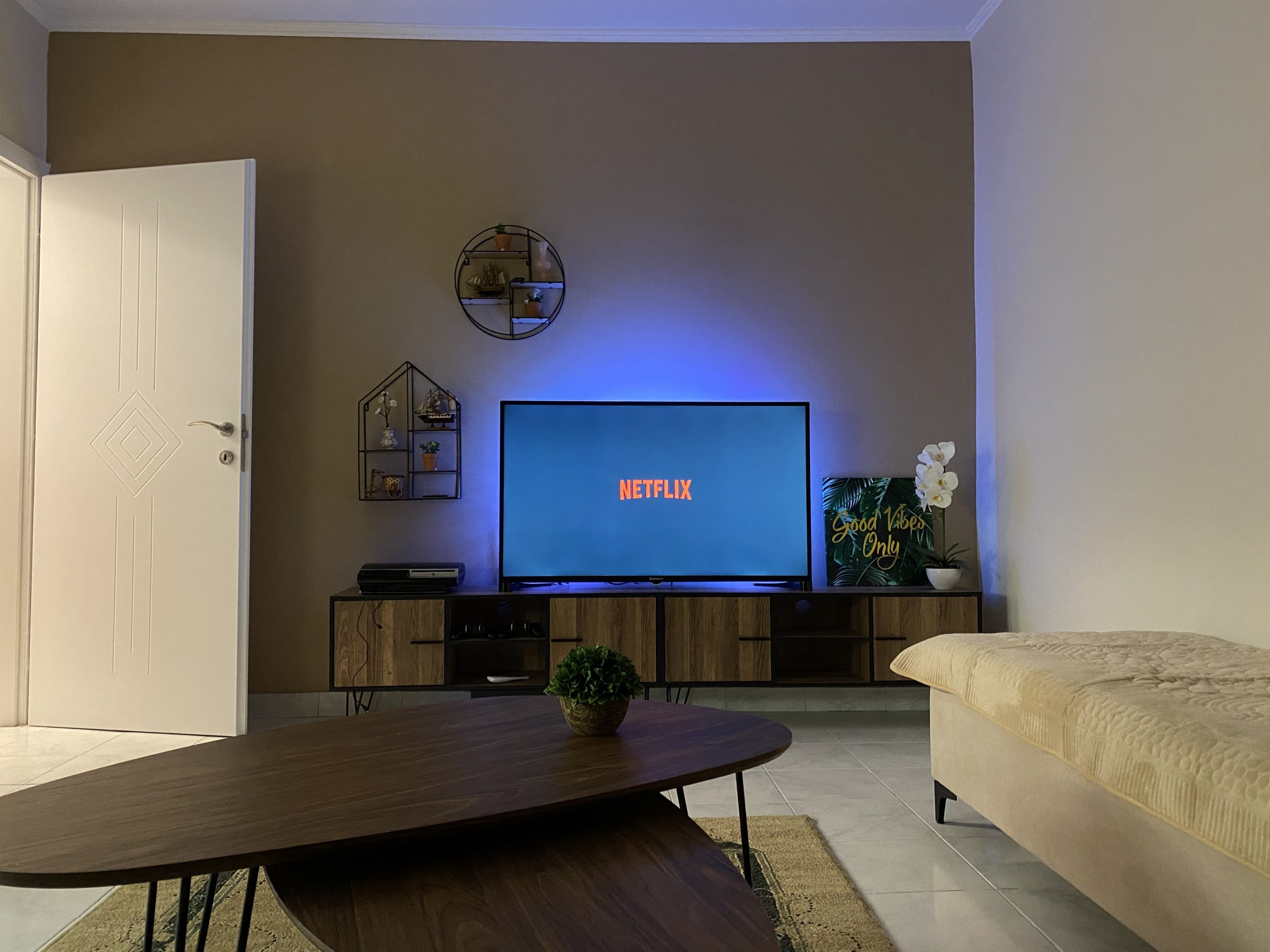 - Amenities: Air conditioning, Balcony, Bed linens, Body soap, Cleaning Products, Clothing storage, Cooking Basics, Dining area, Dining table, Dishes and silverware, Drying rack for clothing, Essentials, Ethernet connection, Extra pillows and blankets, Flat-screen TV, Free parking, Free WiFi, Freezer, Game console (PS4), Hair dryer, Hangers, Hot water, Iron, Kitchen, Long term stays allowed, Netflix, Oven, Refrigerator, Room-darkening shades, Shampoo, Shower gel, Single level home, Stove, TV, Washer, Wine glasses